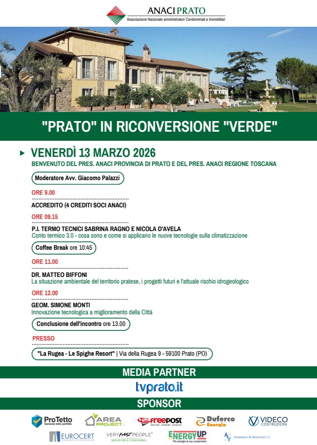 ‘Prato in Riconversione Verde’. E’ il titolo del convegno promosso da Anaci Prato per venerdì prossimo, 13 marzo, dalle 9 alle 13 a ‘La Rugea – Le Spighe Resort’ di Prato. Si tratta della prima iniziativa rivolta agli amministratori di condominio (per gli iscritti Anaci è previsto il riconoscimento di 4 crediti formativi) organizzata dal nuovo consiglio direttivo della delegazione pratese di Anaci. Nuovo corso che ha visto la conferma nel ruolo di presidente di Alessandro Bari, affiancato da Giovanni Scaccini come vicepresidente, Fabio De Santis segretario, Antonio Lombardi consigliere regionale, Lucia Panelli tesoriere, Alessio Ingrassia consigliere provinciale.