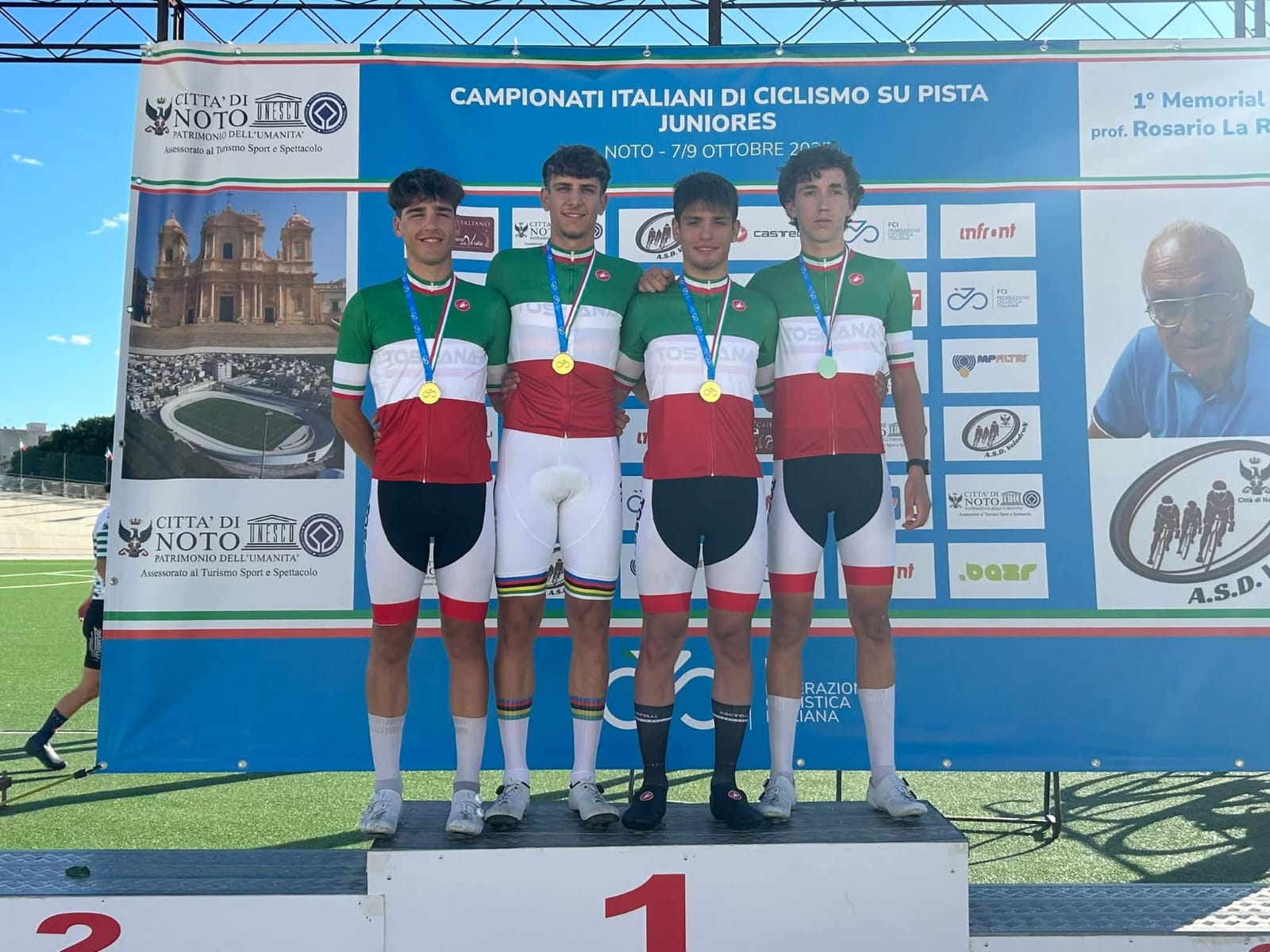 Nuove importanti conferme per il giovane montemurlese Pietro Menici, che ai campionati juniores di ciclismo su pista, che si sono svolti a Noto in Sicilia, ha conquistato il titolo di campione italiano. Il 17enne, tesserato per la Casano Stabbia, ha disputato una splendida gara con i compagni di squadra toscani Matteoli, Ferruzzi e Gaggioli, battendo il Veneto con un tempo di 4.34, 369. Da trent’anni la Toscana non vinceva il titolo italiano nell’inseguimento a squadre juniores.