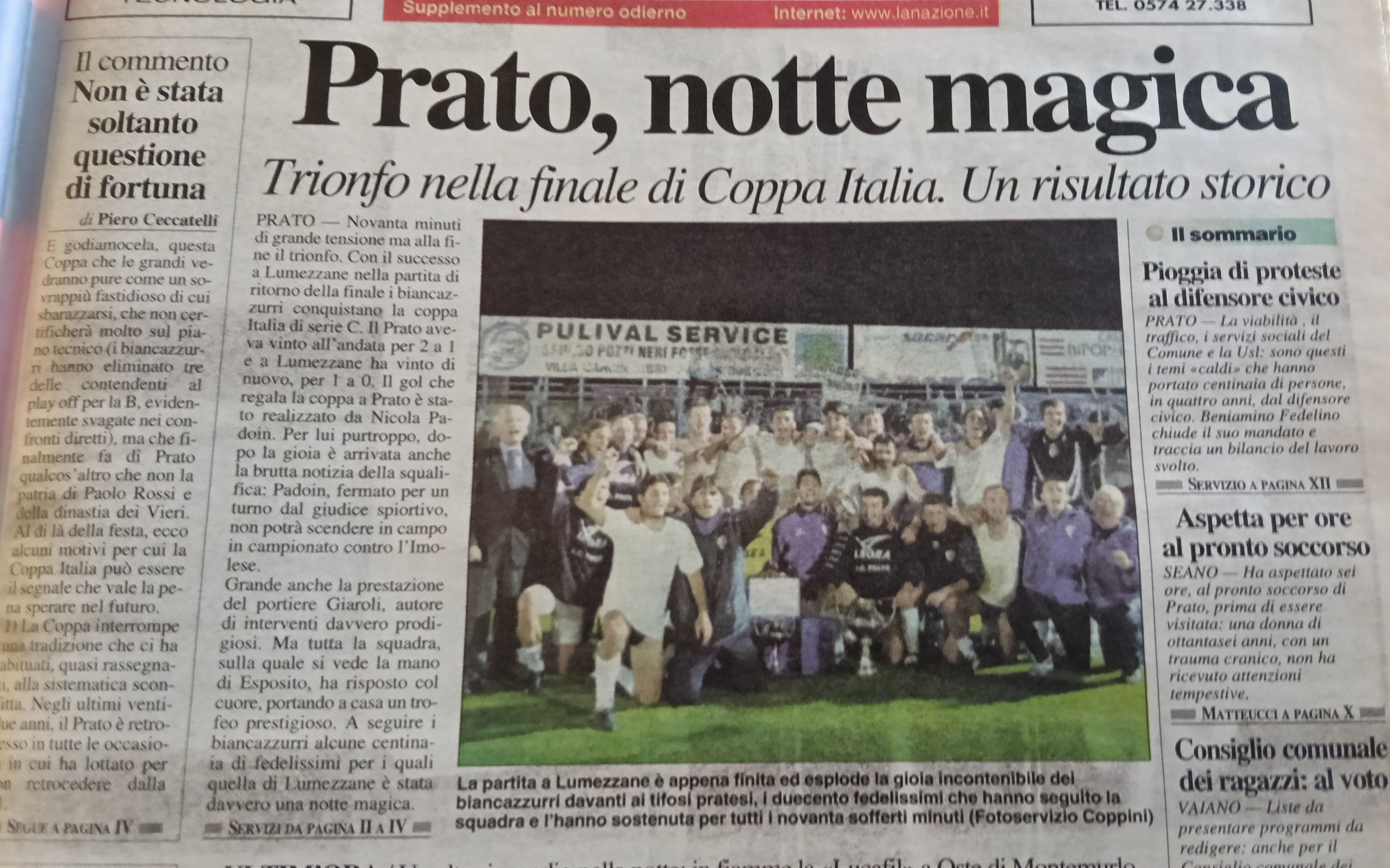 Vi avevo già parlato lo scorso settembre della Coppa Italia di Serie C vinta dal Prato nel 2001. Oggi entriamo nel mese di aprile e siamo prossimi al compimento del 25° anniversario della vittoria storica del Prato di quella coppa. Infatti, il 25 aprile 2001 venne giocata la finale di andata contro il Lumezzane allo stadio Lungobisenzio e il 1 maggio quella di ritorno a Lumezzane, che decretò la vittoria finale del Prato.