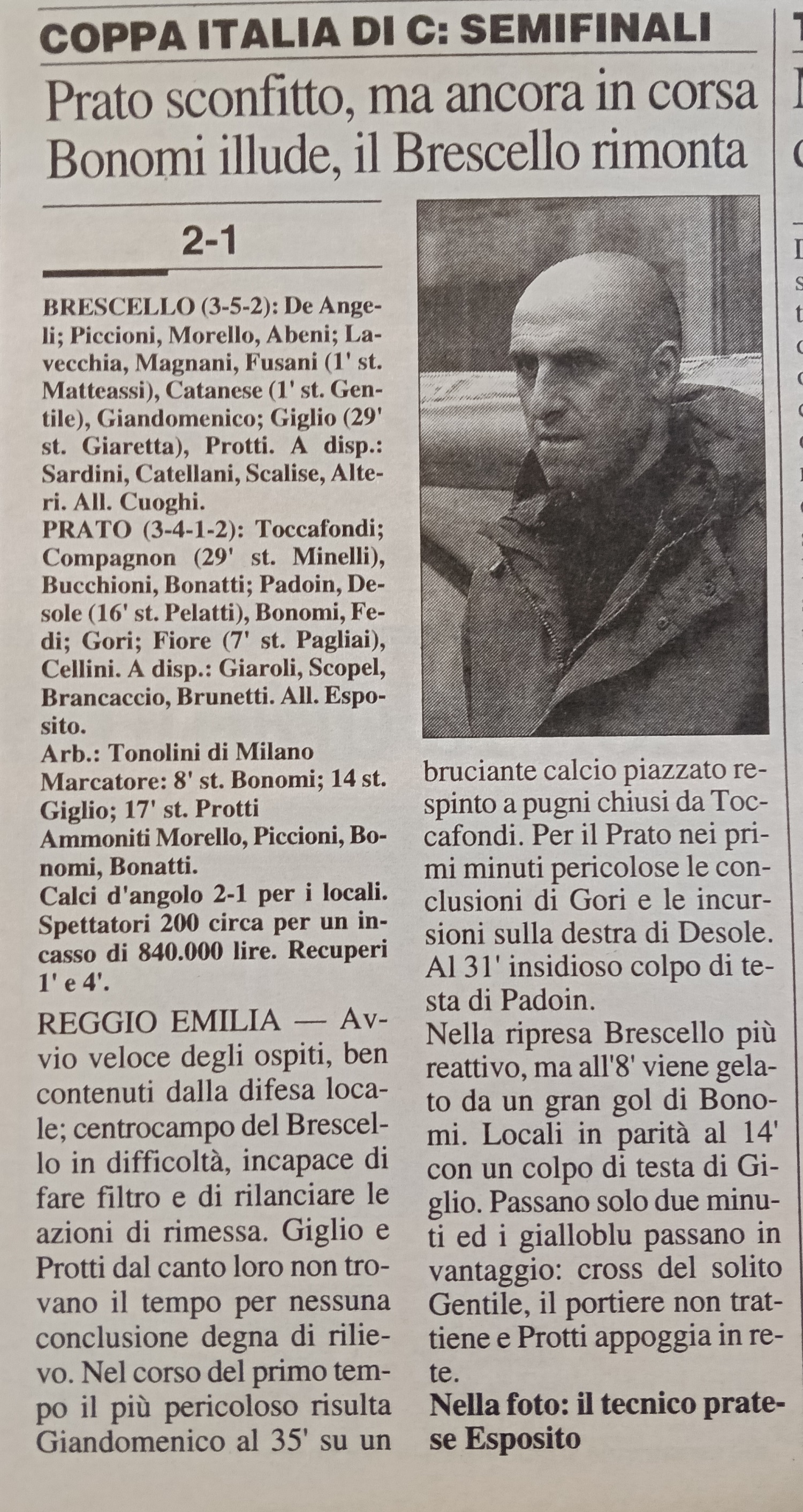 In semifinale il Prato affronta il Brescello di Remondina. La partita di andata viene giocata a Reggio Emilia al Mirabello il 7 marzo 2001. Tutte le reti vengono fatte nel secondo tempo. Segna per primo il Prato con Bonomi. Ribaltano poi la situazione i gialloblu con Giglio e Christian Protti. Risultato finale 2-1 e partita di ritorno ancora aperta.