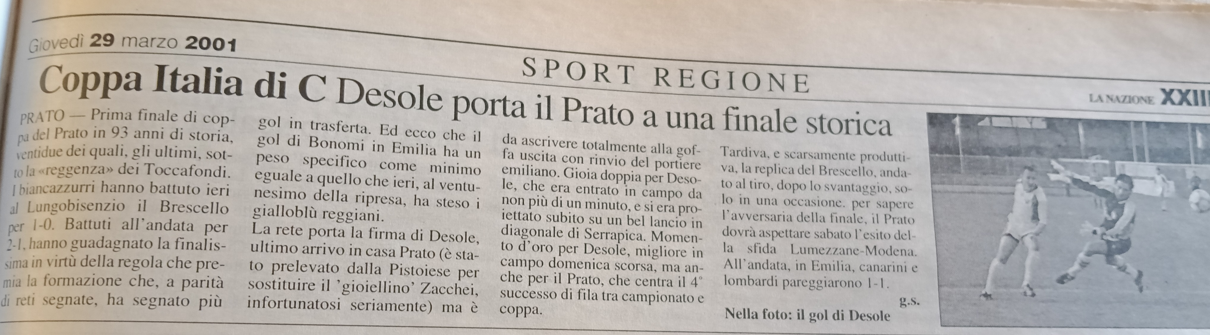 La partita di ritorno viene giocata il 28 marzo 2001 a Prato. Come già successo ai quarti di finale, ai biancazzurri serve una vittoria con 1 goal di scarto per arrivare alla finale di coppa. Il goal decisivo lo segna Desole, arrivato nel mercato di riparazione dalla Pistoiese per sostituire l’infortunato Zacchei. Prato che arriva quindi alla finale di Coppa Italia di Serie C, dove affronterà il Lumezzane. Inoltre, l’accesso alla finale darà diritto ai biancazzurri di giocare la fase preliminare della Coppa Italia di Serie A e B della stagione 2001-2002.