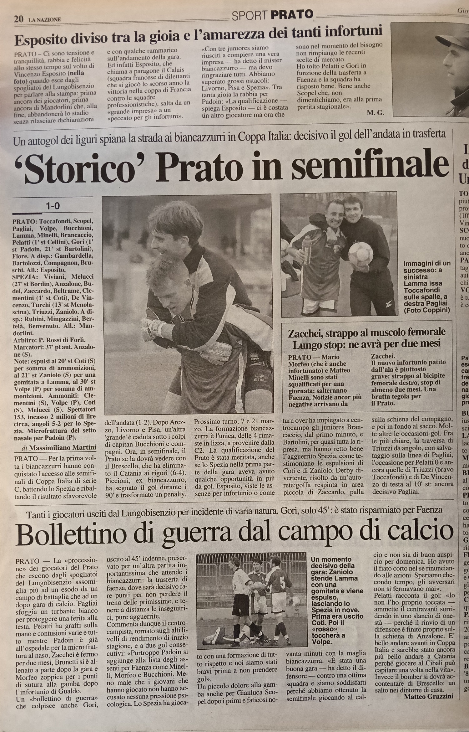 Terza parte con cui ripercorriamo il cammino del Prato nell’edizione della Coppa Italia di Serie C vinta nel 2001 con i sedicesimi e gli ottavi di finale. Vi ricordo che i contenuti pubblicati sono in collaborazione con la pagina Facebook AC Prato 1908 News.