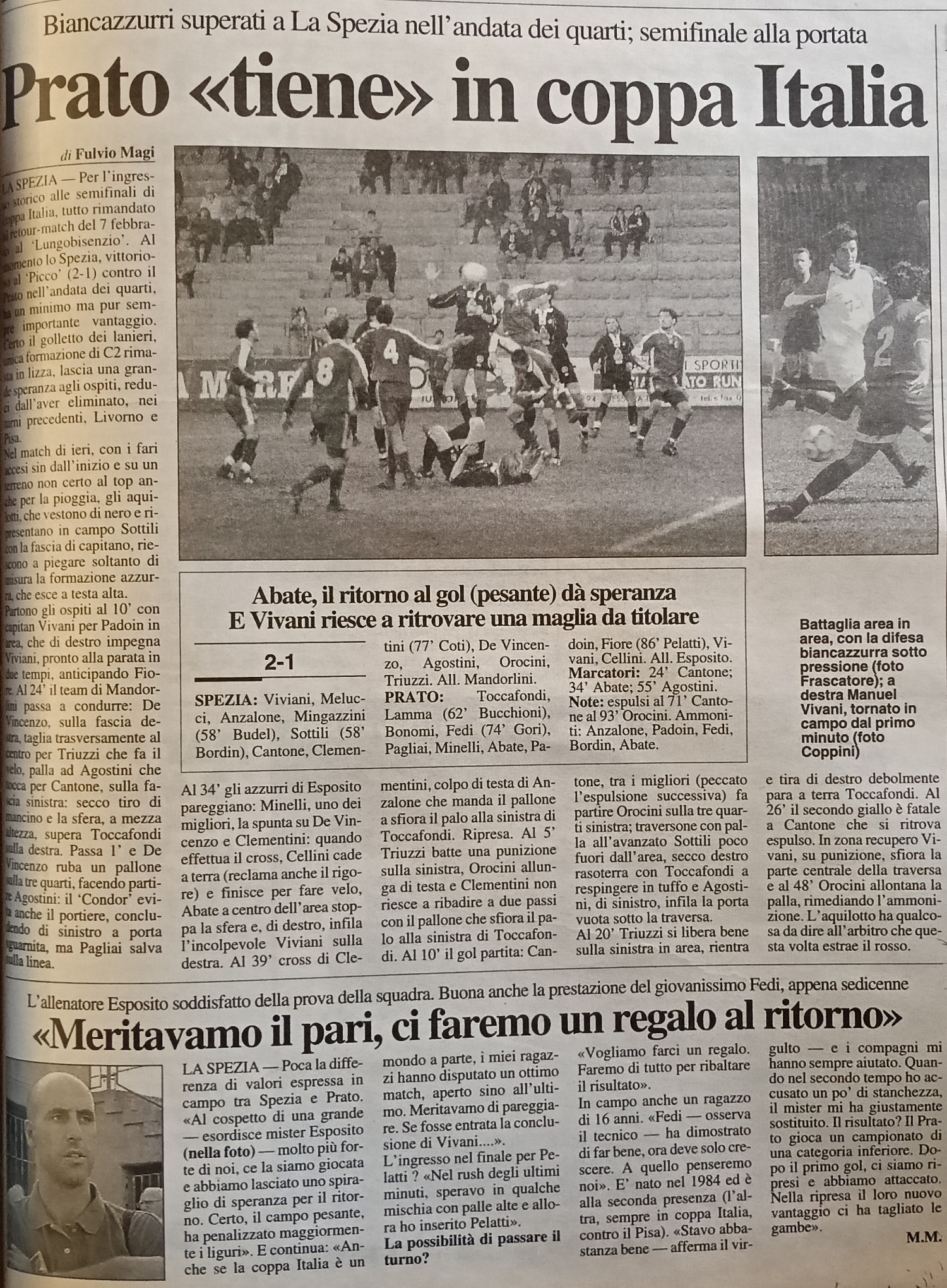 Ai quarti di finale il Prato affronta lo Spezia di Mandorlini. La partita di andata della doppia sfida viene giocata al Picco di La Spezia il 24 gennaio 2001. Nel primo tempo lo Spezia si porta in vantaggio con Cantone, ma il Prato riesce a pareggiare quasi subito con Abate. Nel secondo tempo decisiva la rete dei padroni di casa con Agostini. Risultato finale 2-1 per i liguri e finale di gara molto nervoso con due espulsioni tra i bianconeri.