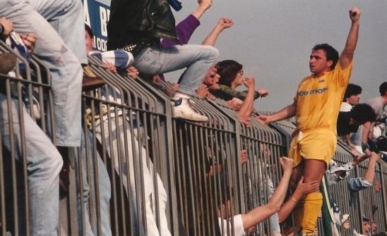 Nel Prato Marco Rossi ha avuto due parentesi da giocatore. La prima dal 1987 al 1989 e la seconda dal 1991 al 1995, totalizzando quasi 150 presenze e una cinquantina di goal. Da sfiorare la Serie B a fine anni ’80, al ritorno in Serie C1 nel 1993, alle sfide storiche contro Pistoiese, Reggiana e Spezia. (Nella foto l’esultanza dopo il goal del pareggio a Reggio Emilia in Reggiana-Prato 1-1 del 1988).