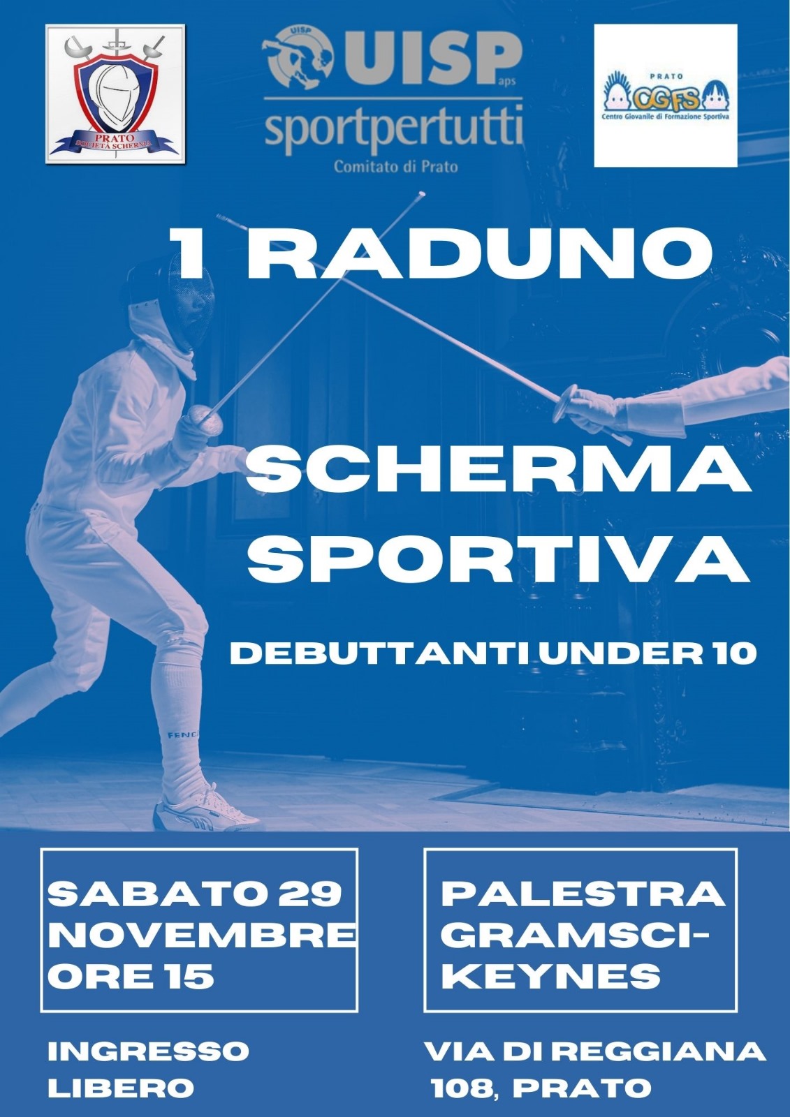 Sabato prossimo, 29 novembre, ore 15, si terrà a Prato un raduno per schermidori sportivi debuttanti. Bambine e bambini di età inferiore ai 10 anni si confronteranno in un incontro organizzato dalla Uisp Prato negli spazi della Società Scherma Prato all’istituto Gramsci Keynes in via di Reggiana 106.