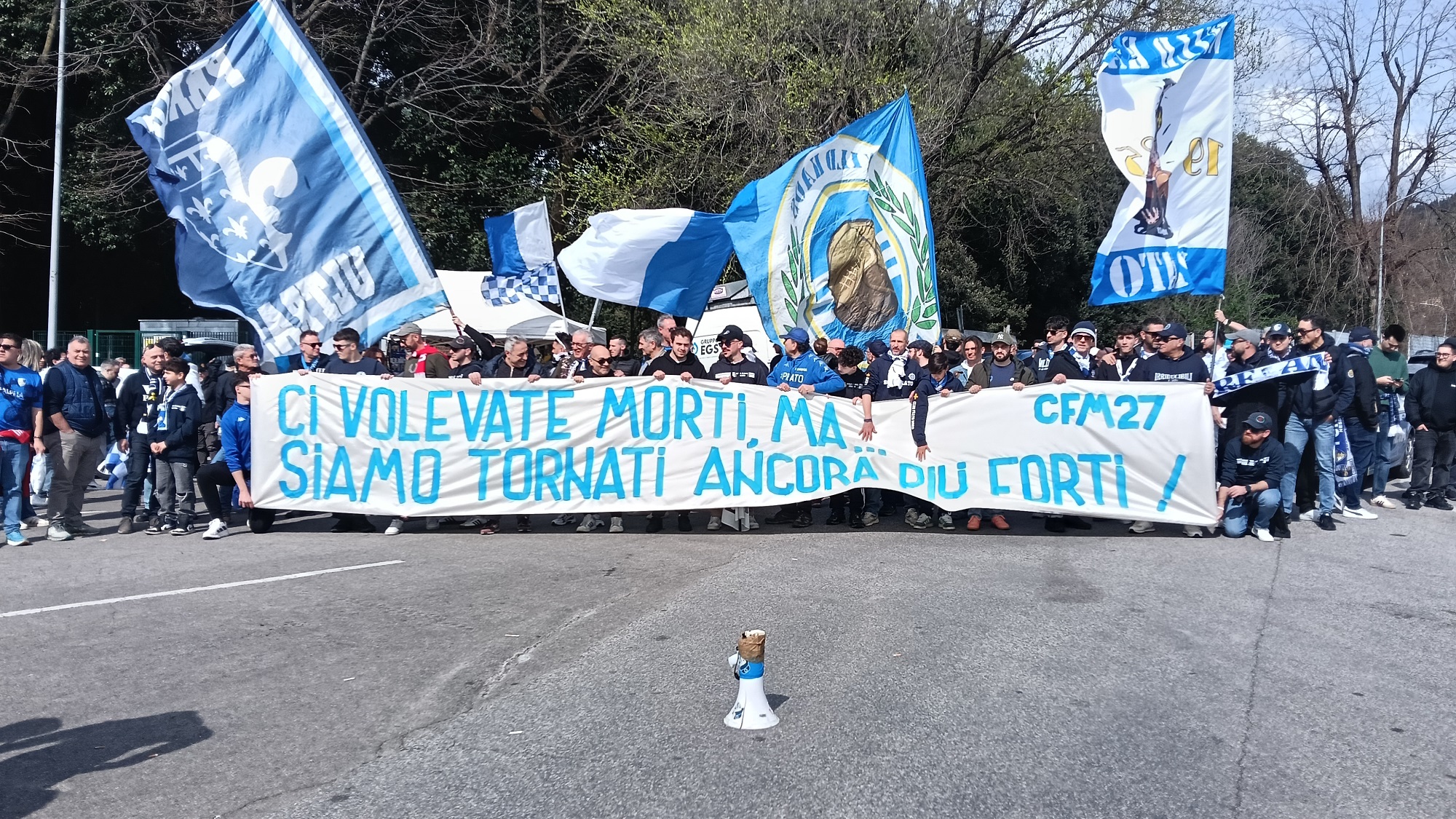 Ma questo che state facendo è un gioco sbagliato, perché noi siamo qui, e siamo stanchi di essere presi in giro, avete deciso per il 18? Benissimo, noi aspettiamo, se non ci sarà la decisione che aspettiamo, scatenerete la nostra rabbia. È inaccettabile questa assurda tiritera, è un insulto alla nostra passione dover vedere tanti tifosi, grandi e piccoli, che non possono venire al nostro fianco, per cosa? Delle cancellate? Una rete divisoria? O il vostro mettervi di mezzo?