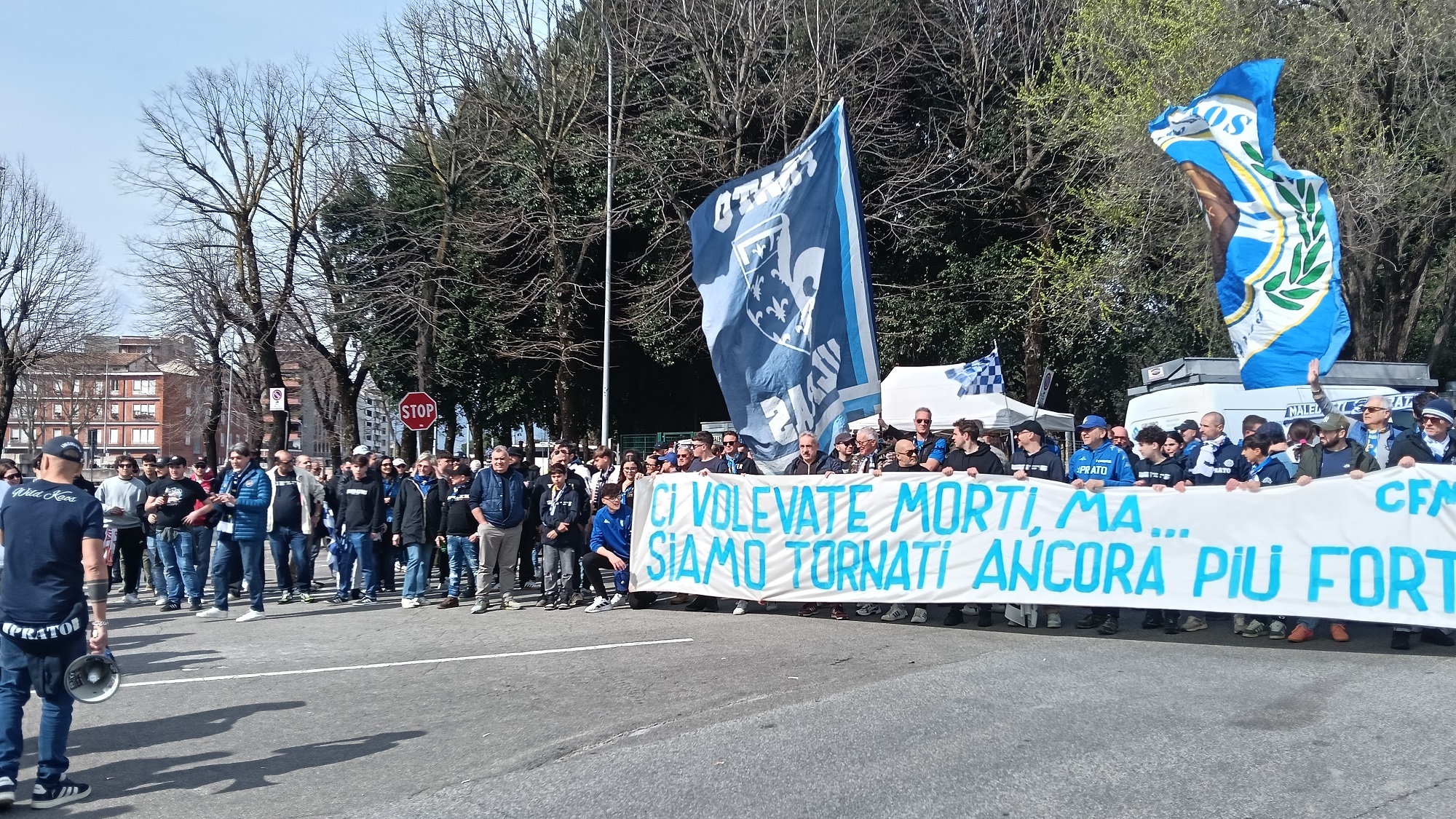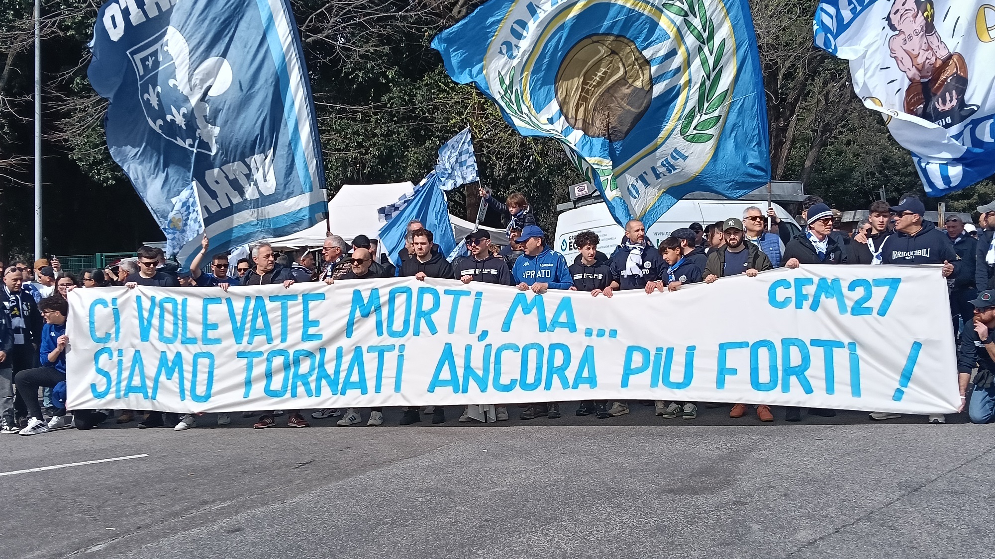 Dopo la lettura del comunicato, i tifosi biancazzurri sono entrati in Curva per supportare il Prato.
