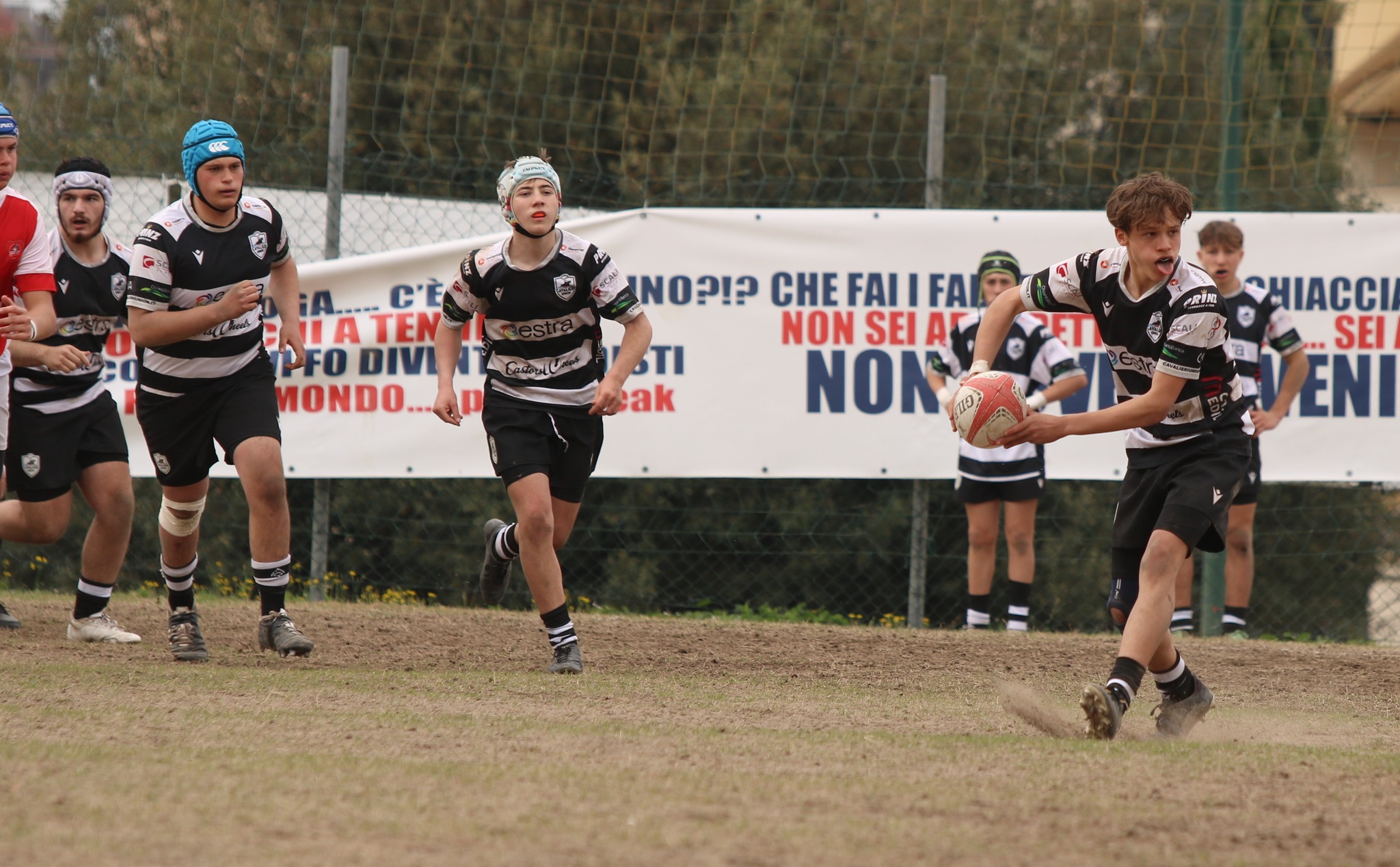 Chiude bene anche l’Under 16 Interregionale 2, che supera Pesaro 45-12 e mette il sigillo su un campionato concluso al terzo posto. Non è stata una partita semplice fin dall’inizio: nel primo tempo gli ospiti hanno sorpreso i Cavalieri con grande fisicità in mezzo al campo, creando più di un grattacapo. Nella ripresa, però, il copione cambia completamente. I ragazzi ritrovano ritmo e voglia di giocare insieme, sfruttano il calo degli avversari e prendono in mano la partita. Il risultato è un secondo tempo ricco di mete, arricchite da azioni di qualità, chiuso poi con una corsa in clubhouse per seguire e tifare i compagni impegnati a Parma: immagine perfetta dello spirito del gruppo.